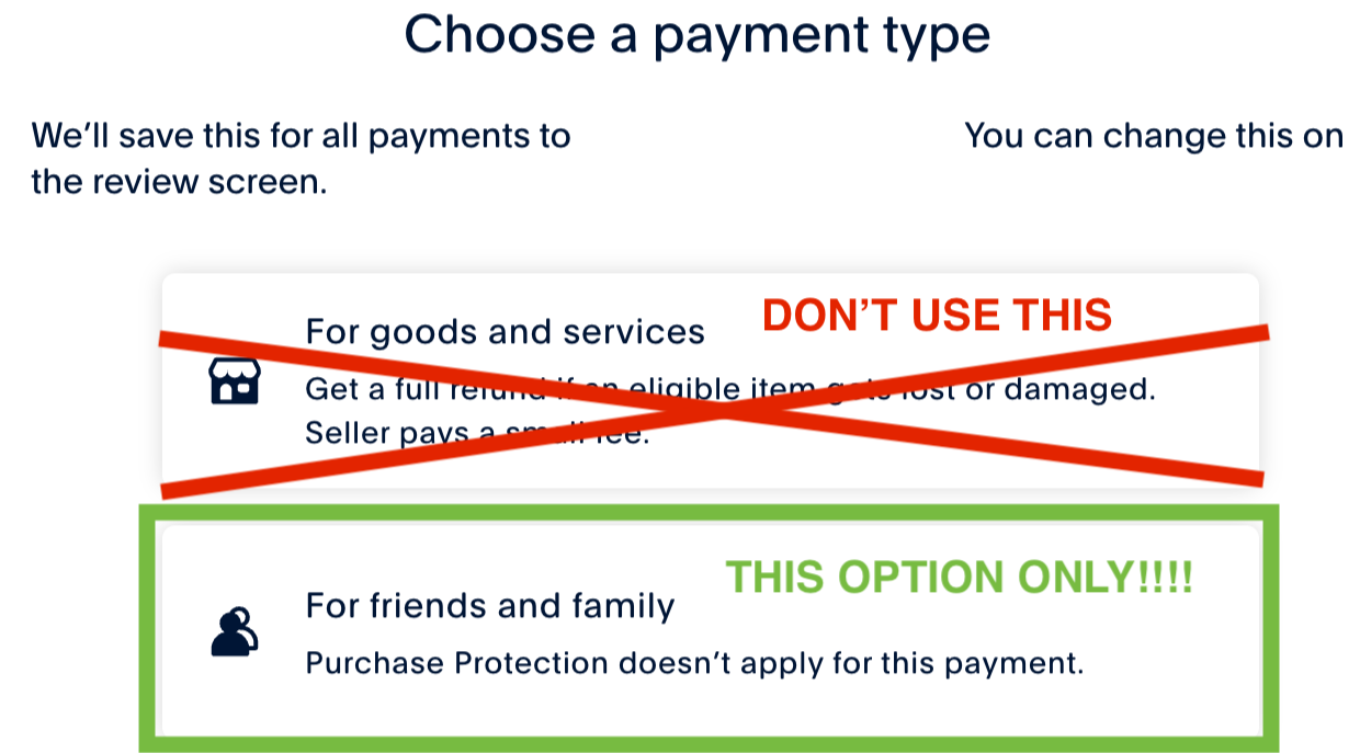 PAYPAL: Use Family & Friends only!!! (see image below)